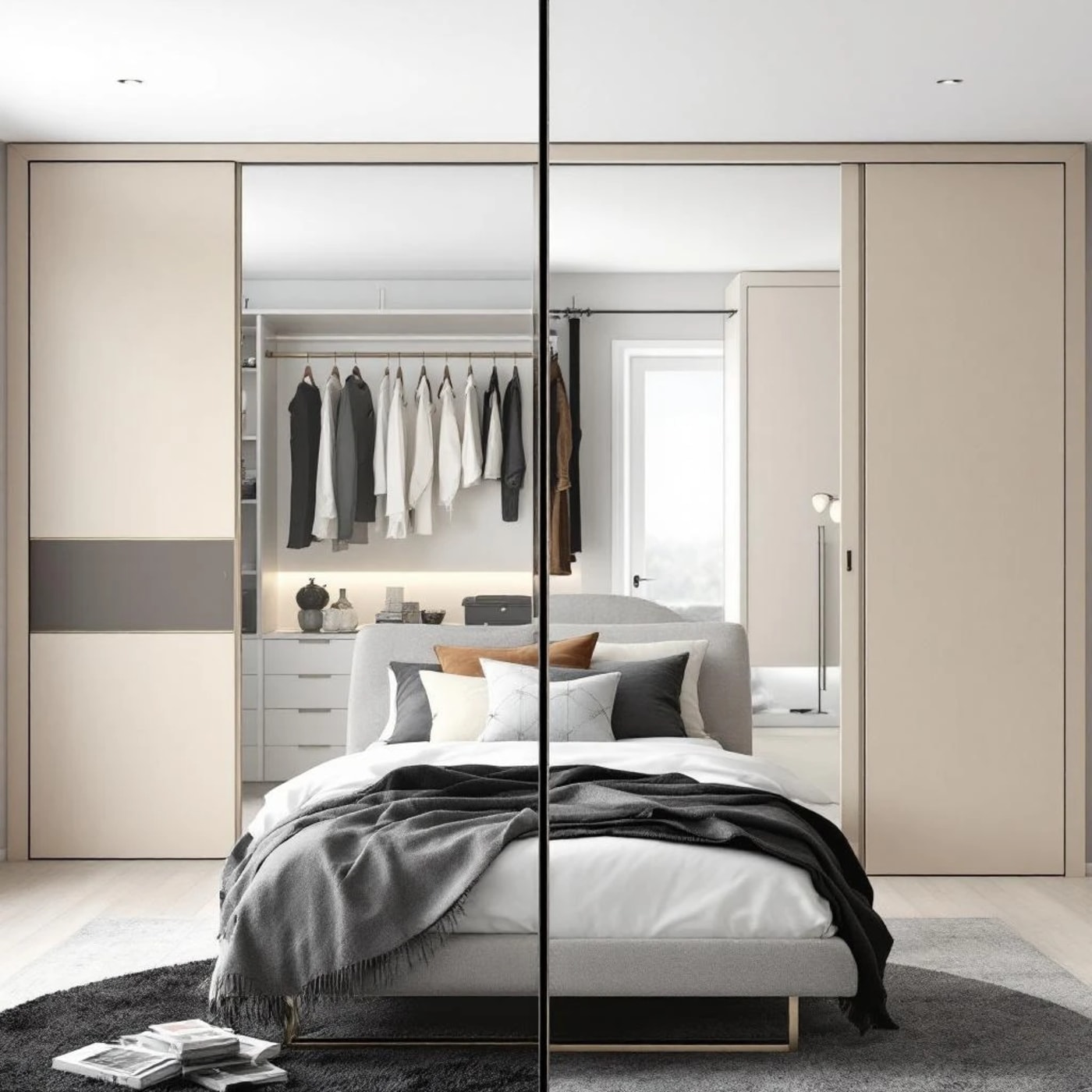 The trend in 2026 is firmly towards sliding doors with a minimal frame — think handleless, push-to-open, or a slim aluminium frame in black or brushed gold. Mirrored sliding doors remain hugely popular for making bedrooms feel larger and doubling as a full-length mirror.