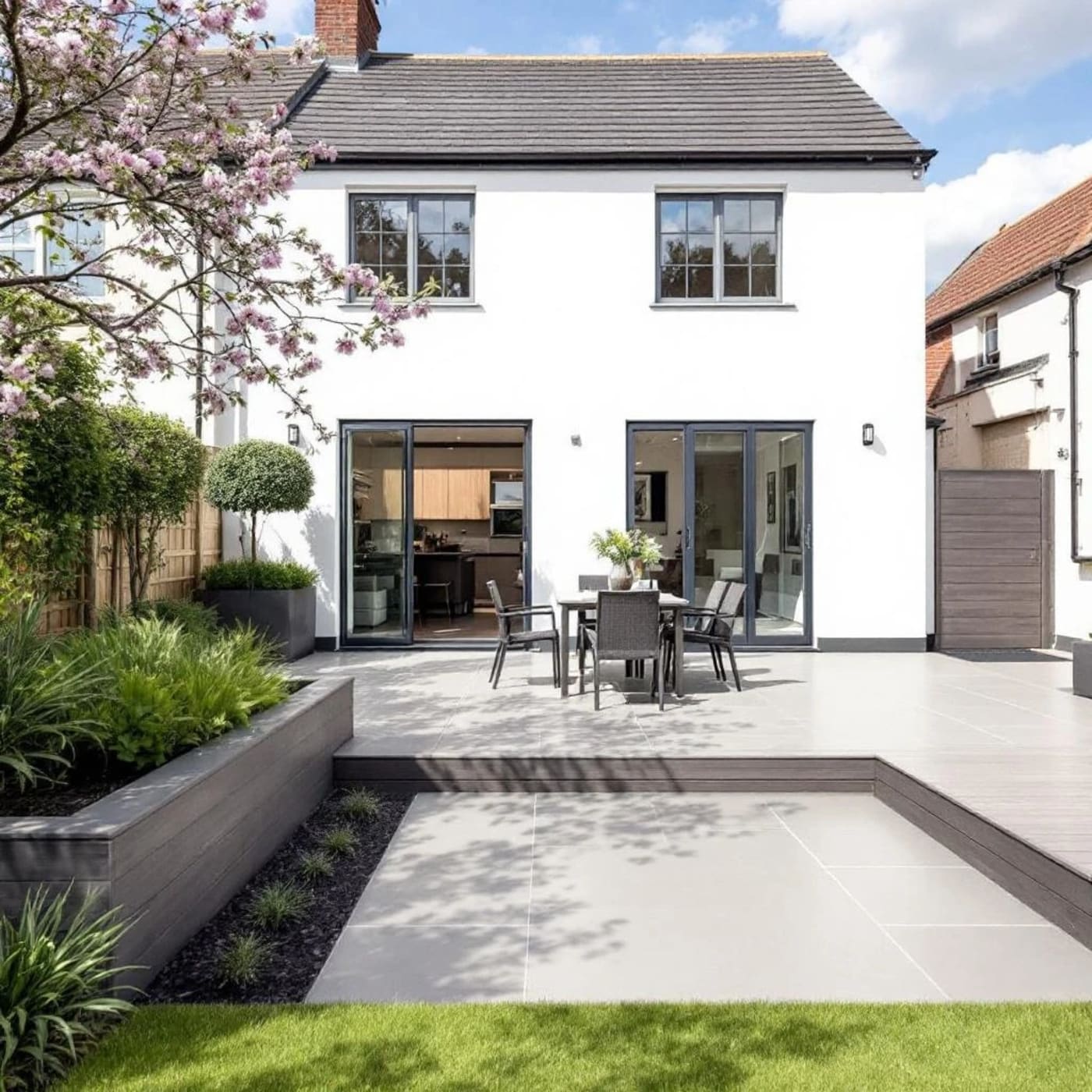 Porcelain patio + composite decking is the most popular combination for new builds in 2026. It's contemporary, low maintenance, and complements the modern architecture. A porcelain patio directly outside the back door (3m x 4m) with a composite decked area further into the garden creates two distinct outdoor living zones.
