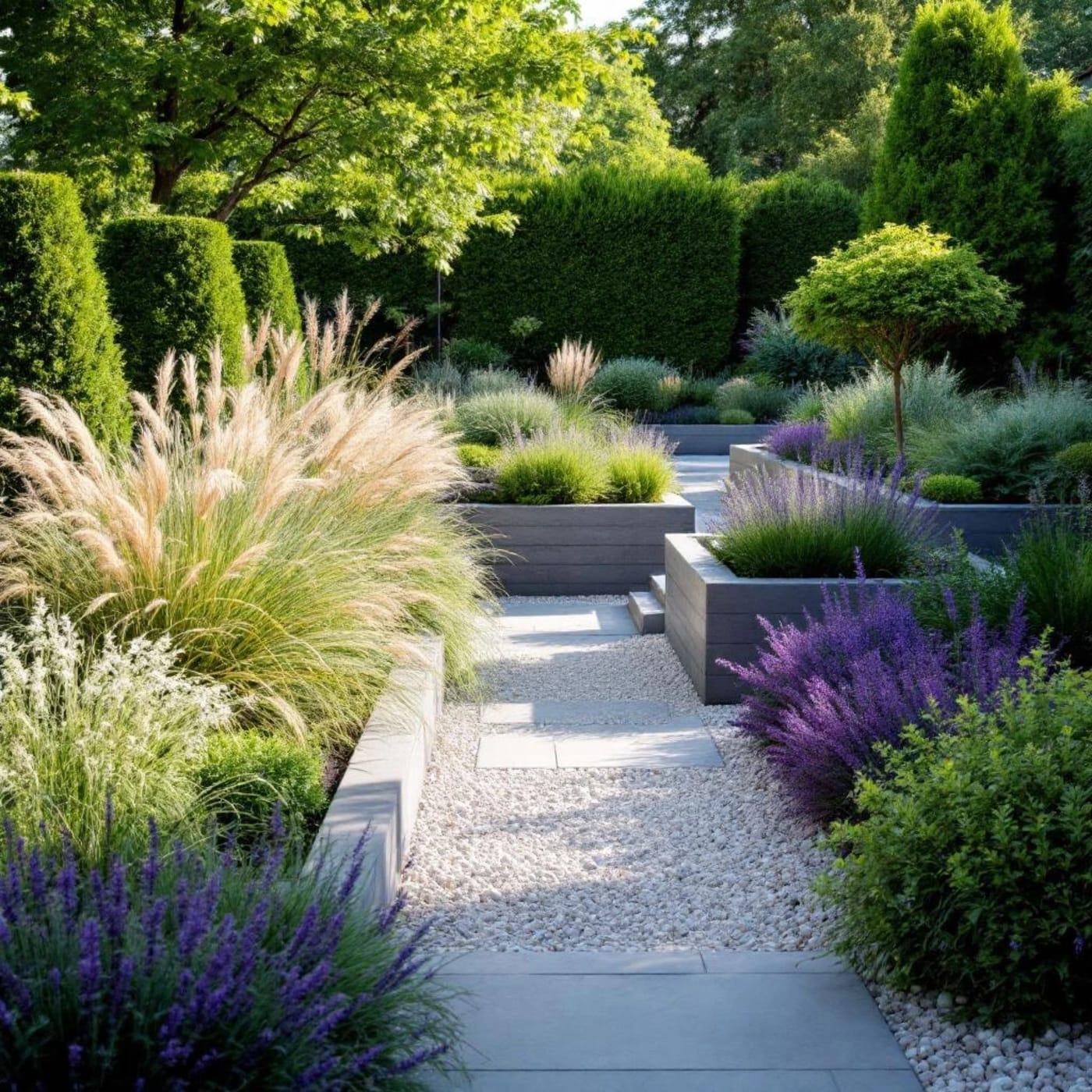 Ornamental grasses (Miscanthus, Stipa, Carex): The ultimate new build plant. They look modern, move in the breeze, need almost no maintenance, and thrive in poor soil. A row of Miscanthus along the back fence instantly transforms a bare boundary.